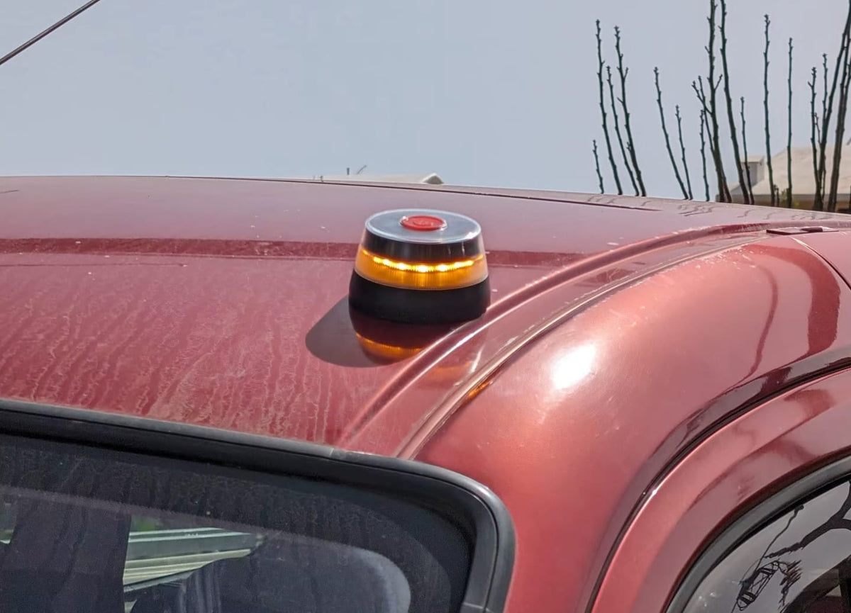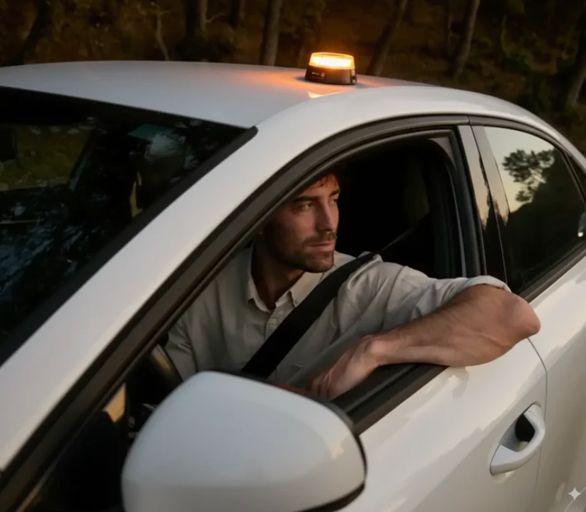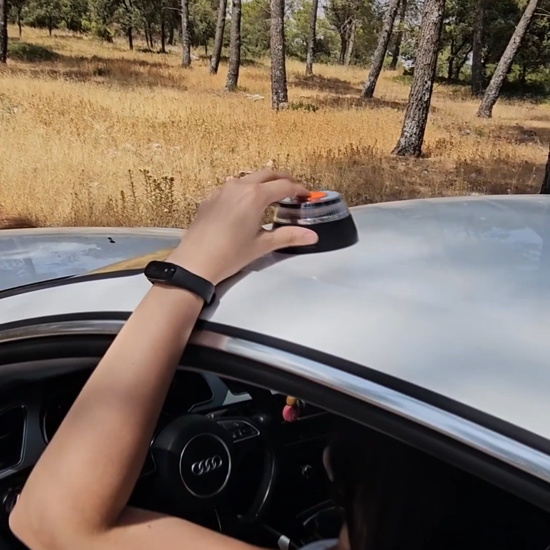 En el techo del vehículo, sin necesidad de bajar. Se adhiere mediante un imán y se activa con un solo botón, garantizando visibilidad inmediata y seguridad máxima.